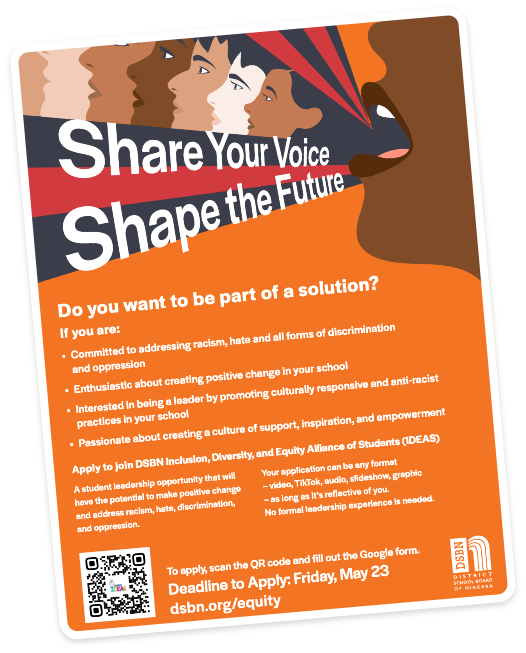 Inclusion, Diversity, Equity Alliance of Students (IDEAS) is a group of passionate and thoughtful student leaders who want to make DSBN schools more welcoming and inclusive for everyone. They believe in justice, equity, and human rights and are committed to addressing racism, discrimination and exclusion.